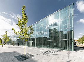 Im Zentrum von Dessau gelegen, bildet das Bauhaus Museum Dessau sowohl eine Grenze als auch eine Verbindung zwischen Stadtzentrum und Natur im Stadtpark. Je nach Lichtverhältnis spiegelt sich die Umgebung unterschiedlich stark in der Glasfassade oder erlaubt Durchblicke. Betritt man das Gebäude, erscheint jedoch alles offen und transparent.