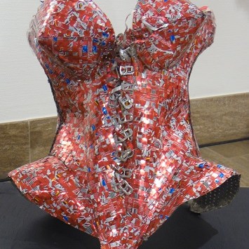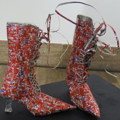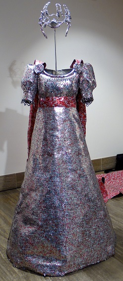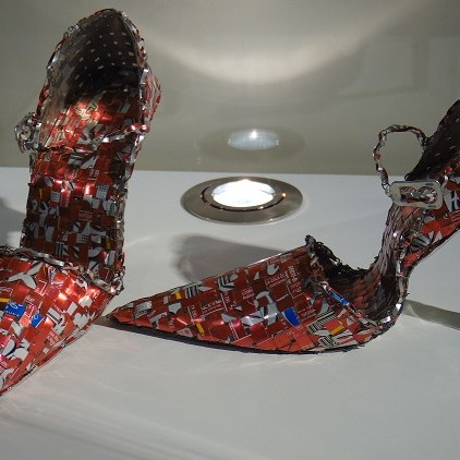 Man muss schon ziemlich nah herangehen, um festzustellen, dass diese traumhaften Roben, sexy Schuhe und eindrucksvollen Wandbilder aus feinen Streifen von Cola-, Limo- oder Bierdosen bestehen. Geschaffen hat diese schier unglaublichen Werke der Kostümdesigner Nikos Floros für die Ausstellung „Sculptured Costumes Maria Callas“ im Düsseldorfer Rathaus.