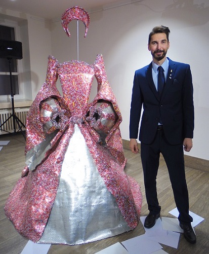 Das Besondere ist das Material, aus dem diese skulpturalen Werke bestehen: Der Künstler verwebt in einem von ihm 2003 patentierten Verfahren unzählige aus recycelten Getränkedosen gewonnene Streifen zu Gewändern, Bildern und Schuhen. Allein 5.000 Aluminiumdosen hat der Künstler für das Gewand der englischen Königin gebraucht. In der Schau im Düsseldorfer Rathaus sind einzigartige Arbeiten aus rund 20.000 Soda- und Bierdosen zu bewundern.