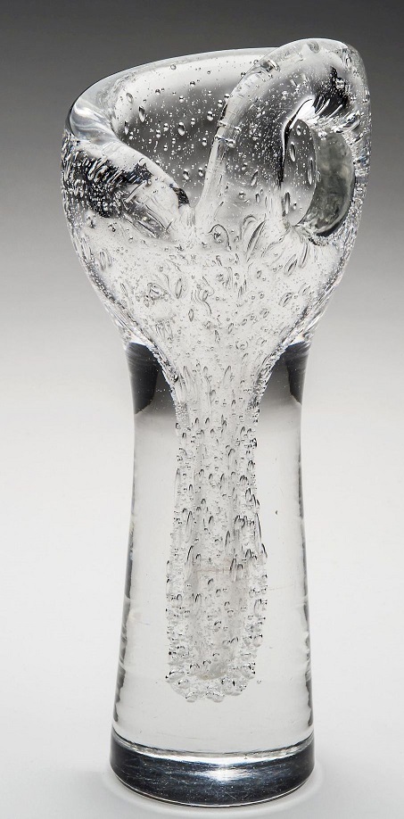 Der Wasserdampf, der beim Kontakt mit dem heißen Glas entsteht, dringt direkt in das Glas ein und erzeugt Blasen. Das Glasobjekt „Ochid“ von 1954 ist Sarpanevas am weitesten verbreitete Werk, das in dieser Technik hergestellt wurde. Es ist neben vielen weiteren Objekten in der Sonderausstellung in Gernheim zu sehen.