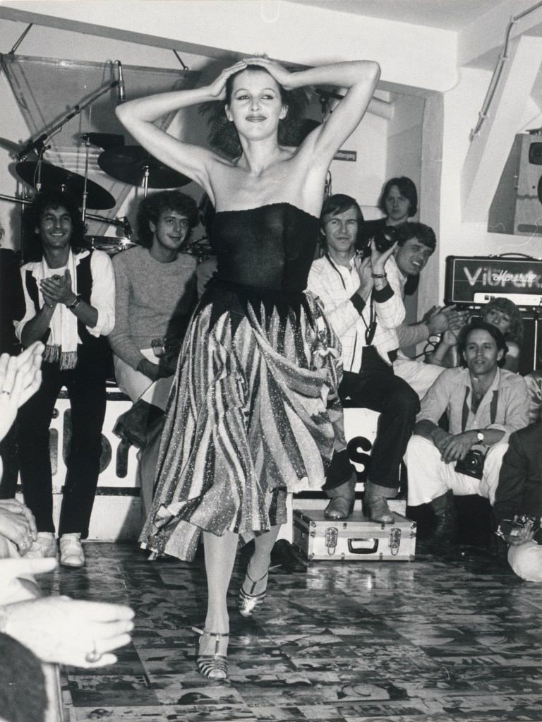 Im nächsten Kapitel wird das besondere Verhältnis Claudia Skodas zur Musik erörtert: Es gehörten nicht nur zahlreiche Musiker*innen zu ihrem Kundenkreis – u.a. David Bowie, Malaria!, Tangerine Dream, die Neonbabies, Donna Summer, Cher, Tina Turner und Rufus Wainwright – ihre Kollektionen sind auch voller Anspielungen auf verschiedenste Musikrichtungen – Jazz, Glamrock, Disco, Punk, Elektro. 1981 wechselte Skoda für kurze Zeit selbst die Disziplin und landete gemeinsam mit Rosie Müller mit ihrer EP I bin a Domina einen Undergroundhit. Elektromusik-Pionier Manuel Göttsching mischte das Stück, Ralf Hütter und Karl Bartos von der Band Kraftwerk gestalteten das Cover.