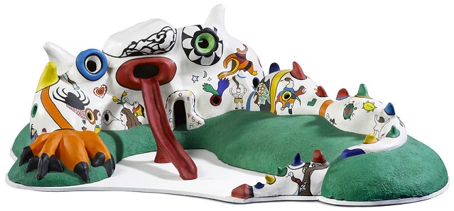 Saint Phalle schuf fantastische und figurative Häuser, Parks und Spielplätze. Diese Strukturen waren aufgeladene Räume der Imagination, aus denen sie sich experimentelle Gesellschaften vorstellte, Orte, „an denen man eine neue Art von Leben haben konnte, um einfach frei zu sein.“ Im Mittelpunkt dieser Vision stand Tarot Garden, eine massive skulpturale Installation außerhalb von Rom, die seit 1998 für die Öffentlichkeit zugänglich ist. Die filigranen Details und organischen Formen der Strukturen des Gartens, die auf den 22 großen Arkana des Tarotdecks basieren, unterstreichen Saint Phalle’s Glauben, dass Kunst die Wahrnehmung verändern und die Realität verändern kann.