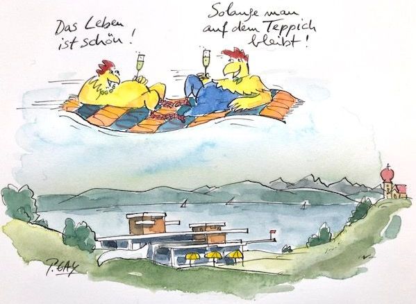 Dass in diesem »Huhniversum« auch menschliche Charaktere zu ihrem Recht kommen, führen über Jahrzehnte nicht nur „Die Paar Probleme“ in der Frauenzeitschrift BRIGITTE vor Augen, sondern auch zahlreiche andere Zeichnungen und Aquarelle. Reiseskizzen, Objekte und Collagen ergänzen das Spektrum der Schau.