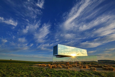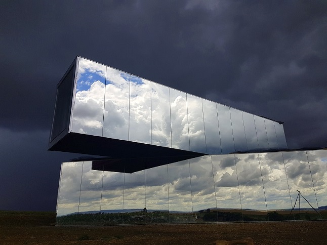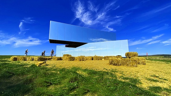 Die SPIEGEL|ARCHE – zwei riesige verspiegelte Container, schräg übereinander gestellt auf einem Hügel, mitten in der Stille der Landschaft, unweit von Weimar – feierte 2020 Richtfest. Eingeladen wurde zum Blick auf und in das skulpturale Gebäude mit der Erfahrung des sich veränderten Sehens auf sich selber und die Natur.