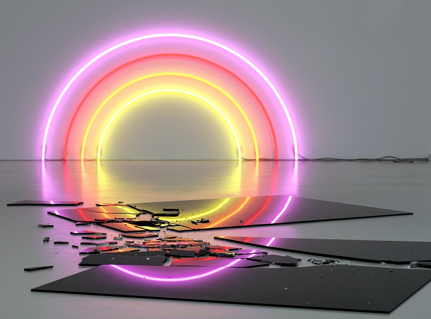 Fragen nach Romantik, Glück und Utopien stellen sich bei Lori Hersbergers Sunset 164 (2006): Bunte Neonbögen täuschen einen ewig währenden Sonnenuntergang vor – ein Zustand, der weder Tag noch Nacht ist und schnell in der Schönheit des bloßen Scheins endet.