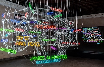 Ein Schlaglicht auf einen handfesten politischen Skandal wirft die spektakuläre Neon-Installation Pizzagate Neon (2016) von Warren Neidich, mit der ein politisch motivierter Fake-News-Skandal im Vorfeld der amerikanischen Präsidentschaftswahl 2016 rund um Hillary Clintons angeblicher Verwicklung in einen Kinderporno-Ring thematisiert wird.