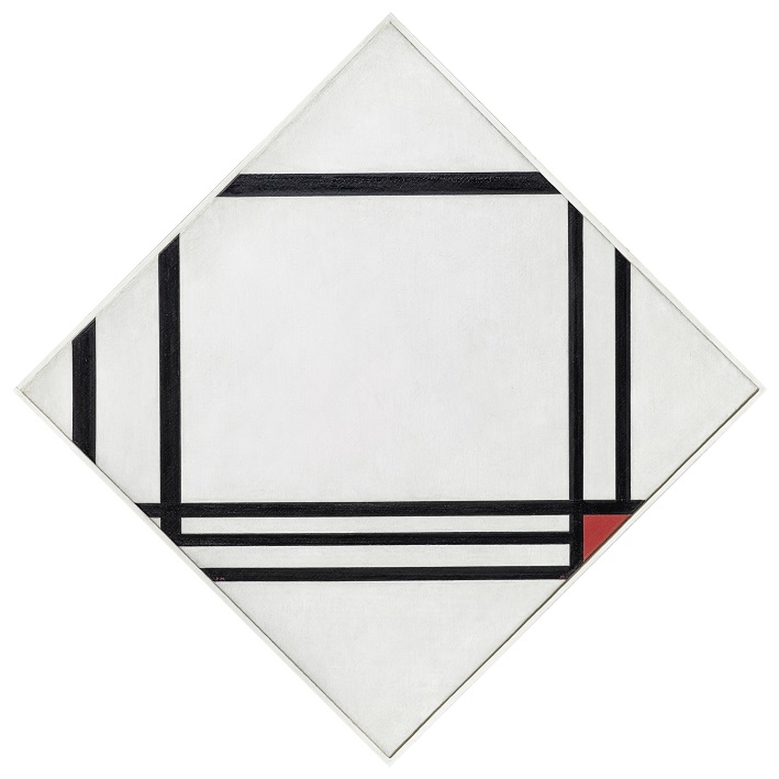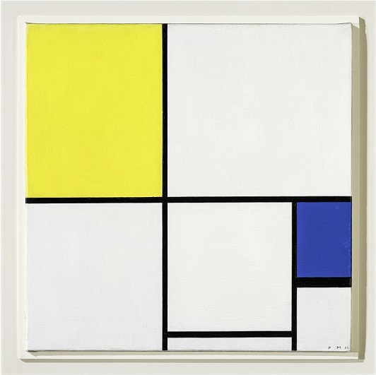 Erst ab Anfang der 1920er-Jahre verlegte sich Mondrian auf eine komplett gegenstandslose Bildsprache, die sich auf die rechtwinklige Anordnung von schwarzen Linien mit Flächen in Weiß und den drei Grundfarben Blau, Rot und Gelb beschränkte.