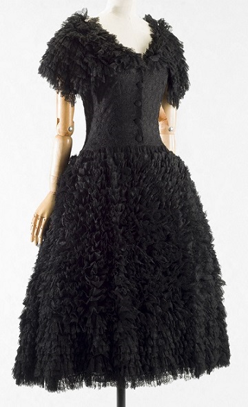 Schwarze Spitze, Stickereien, Samt, drapierte Seide, Fransen oder schimmernde Pailletten – jedes Couture-Stück ist prächtig ausgeführt. Balenciaga fertigte sogar seine Prototypen in Schwarz an, ganz im Gegensatz zur ungebleichten Baumwolle, die die meisten Couturiers damals verwendeten. Die Ausstellung zeigt die bezaubernde und spielerische Auseinandersetzung des Couturiers mit der Farbe Schwarz.