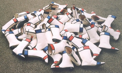 Mit dazu beigetragen hat der Designer Yves Saint Laurent. Seine berühmten Cocktailkleider überführen Mondrians Ideen in den 1960er-Jahren in die Welt der Haute-Couture. Sylvie Fleury thematisiert in ihrer Arbeit Mondrian Boots (1992) eben diese Aneignung der Kunst durch die Fashionindustrie.