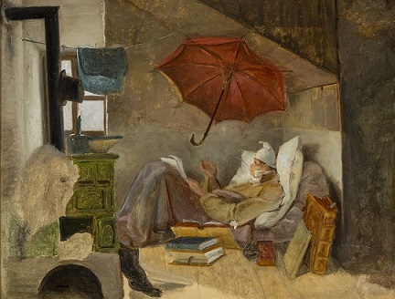Denn dieser rote Schirm gibt ein Rätsel auf: Von 1835 bis 1880 malt der vom Theater und der Symbolsprache der barocken niederländischen Kunst begeisterte Spitzweg ihn wie ein Requisit immer wieder in seine Bilder hinein. Neben der Häufigkeit sind es vor allem die Beiläufigkeit und die scheinbare Belanglosigkeit, die ihn in den Vordergrund treten lassen.