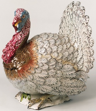 Die Exponate der Ausstellung zeigen, was Gastgeberinnen und Gastgebern am Hof des 18. Jahrhunderts wichtig war: Sie wollten ihre Tischgäste beeindrucken! Dies gelang mit spektakulären Terrinen, die in Formen von ganzen Tieren gestaltet wurden. Die Terrine in Form eines Truthahns aus Straßburg (um 1745–54) fasziniert durch ihre Größe, lebendige Modellierung und Feinheit der Bemalung bis heute. Die Nahtstelle verschwindet gekonnt unter dem überlappenden Flügel. Im Vergleich zur traditionellen Präsentation von Vogelpasteten, die mit echtem Gefieder dekoriert waren, boten Vogelterrinen aus Fayence eine kunstvolle und nachhaltigere Alternative für die Tischdekoration.
