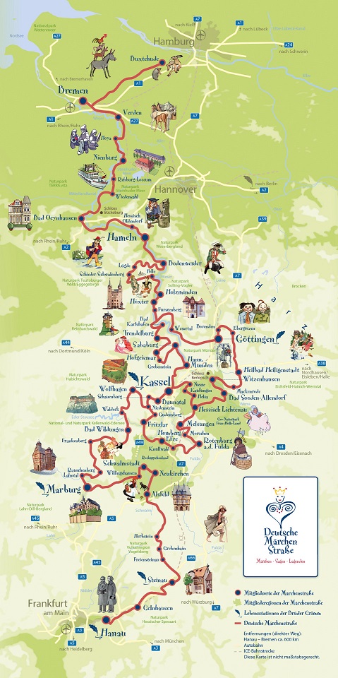 Bis dorthin und auf einem abschließenden Abstecher nach Buxtehude führt sie durch unterschiedliche Natur- und Kulturlandschaften, abgelegene Dörfer, heimelige Fachwerkstädtchen, urbane Kulturzentren – und durch die Grimm Heimat NordHessen. Geschichtsträchtige Burgen und märchenhafte Schlösser, verwunschene Wälder und der bekannte Weserfluss, mystische Sagenorte und ungezählte Märchenbrunnen säumen den Weg.