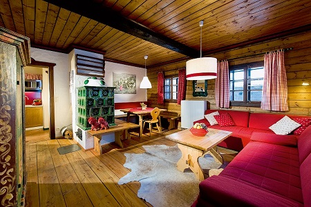 Jedes der 44 Ferienhäuser wurde aus über 400 Jahre altem Bauernhaus-Holz gefertigt und spiegelt diesen urig-rustikalen Charme auch in der Innenausstattung wieder, die mit originalen Bauernhausmöbeln und einem gemütlichen Kachelofen ein besonderes Wohlfühlambiente zaubert.