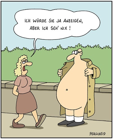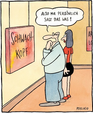 Mit Perscheids Cartoons schaut man lachend in unermessliche und gefährliche Tiefen, bevor man merkt, worüber man da eigentlich lacht. Denn ganz weit unten lauert das Unfassbare, das scheinbar Unsag- und Undenkbare. Und doch: Bei aller Boshaftigkeit und allem Zynismus halten seine Cartoons das nötige Gleichgewicht zwischen Tabu und Witz, Spott und Leichtigkeit. Dieser akrobatische Balanceakt ist die große Kunst des schwarzen Humors, die Perscheid meisterhaft beherrschte.