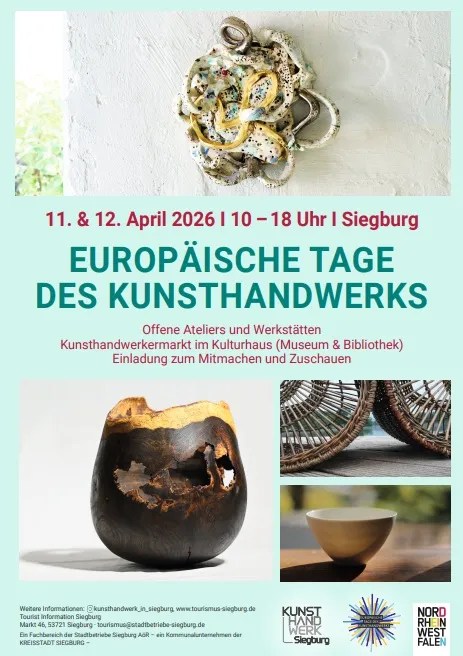 Am 11. und 12. April 2026 verwandelt sich die nordrhein-westfälische Stadt Siegburg wieder in eine Begegnungsstätte des regionalen und nationalen Kunsthandwerks. An zwei Tagen öffnen insgesamt 20 lokale KunsthandwerkerInnen und KünstlerInnen ihre Ateliers und Werkstätten. Außerdem präsentieren nationale Design- und Kunsthandwerkspersönlichkeiten ihre Werke im Kulturhaus am Markt (Stadtmuseum und Stadtbibliothek).